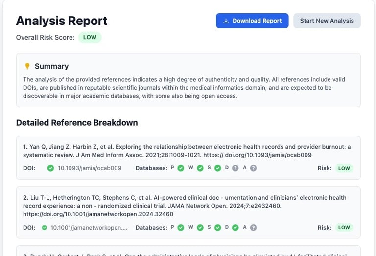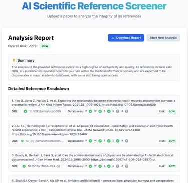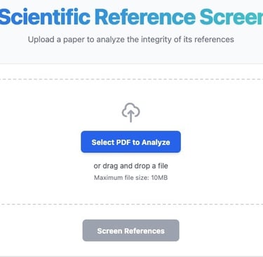 Scientific article references can be incorrect by accident or hallucinated by an LLM. Importantly, they can be misleading on purpose when generated by a paper mill. I wanted to create a way to screen references, primarily for accuracy. Gemini recommended that I verify references by accessing the following resources: DOI, PubMed, Scopus, Web of Science, and the Directory of Open Access Journals. That worked fine but missed pre-print journals. I added arXiv, which is particularly important for computer science-related articles, and made a few minor tweaks. The end result is that it checks these different resources before rating the references as low, medium, or high risk. In the lower left is the page where you upload the article and the report appears in the lower right.