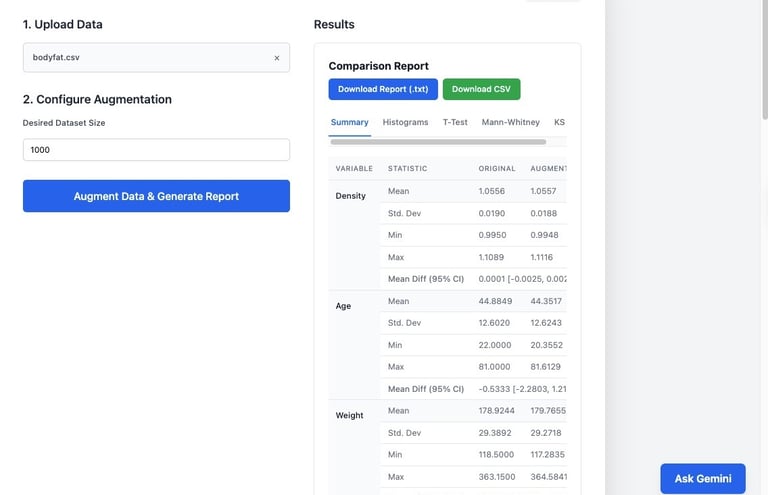 I am evaluating a new technique to clone or augment existing small datasets. The technique uses bootstrapping and adaptive Gaussian noise to create data that is statistically very similar but has no duplicates. I have named this technique BootsGN. Gemini successfully created an app that utilized this technique, which included a necessary upload window, an option to select the size of the augmented dataset, and an automatic download feature for the dataset. I then thought, why not add the statistical tests at the same time to show the degree of similarity? Now, when the data is generated, so is a report that provides descriptive statistics, Kolmogorov-Smirnov tests, Mann-Whitney tests, t-tests, and chi-square tests, where appropriate. You can access the report in the app or the downloaded text report. It also includes histograms.